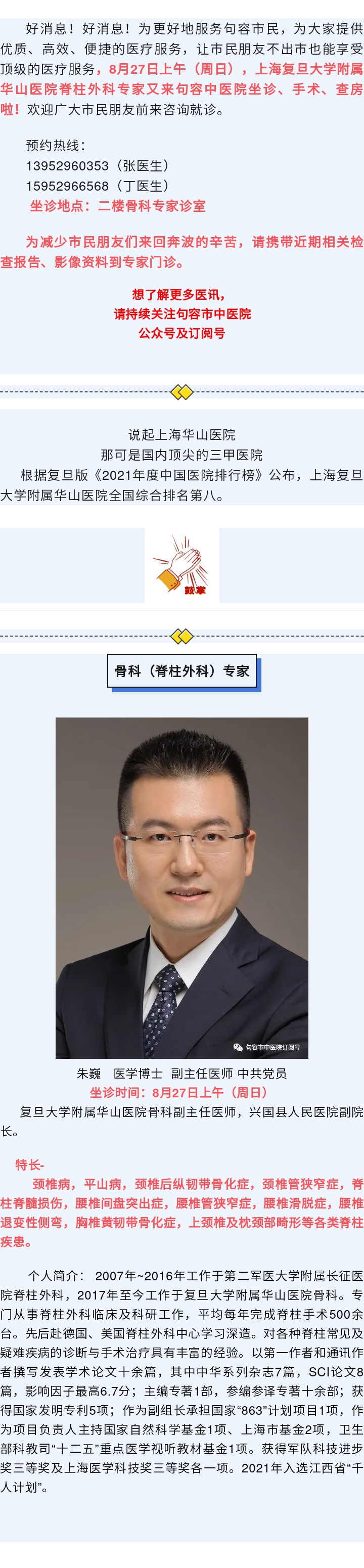 医讯|8月27日上午(周日),上海复旦大学附属华山医院脊柱外科专家又来句容中医院坐诊、手术啦!