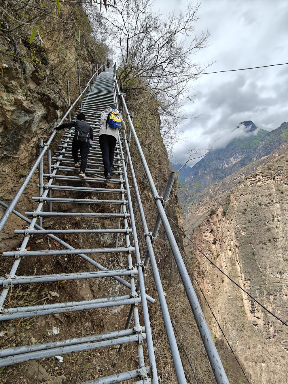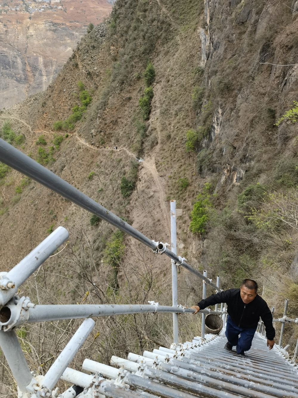 悬崖村因脱贫攻坚而广受关注,外地许多人自发到这里攀登钢梯。钢梯刚开始倒还平缓,翻上几个拐弯后,就陡峭起来,而且越来越险。钢梯之上,一个个身影缩为小点,身子悬空,只敢手脚并用,紧紧拽住钢梯,向上攀去。