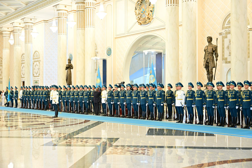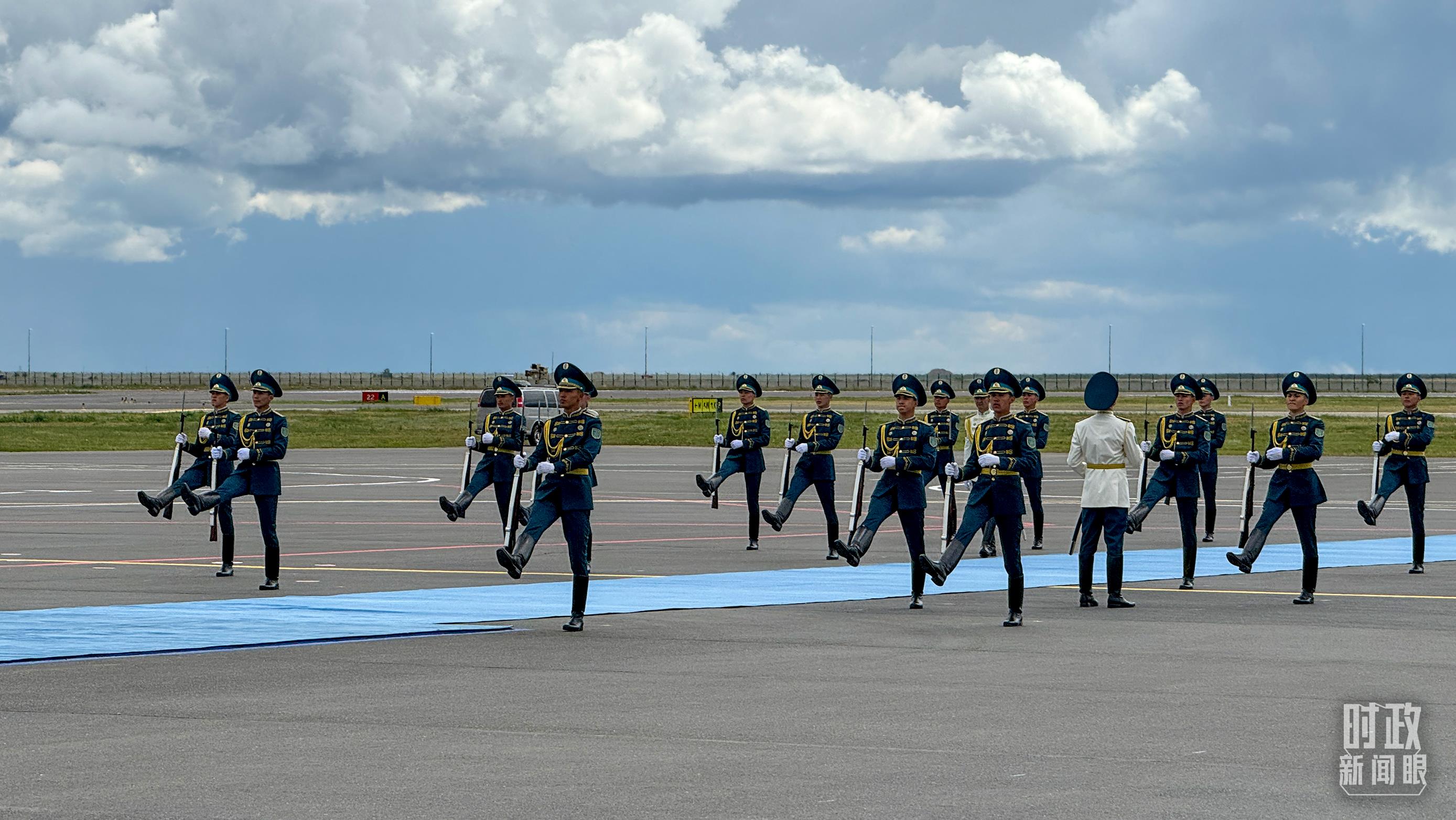 托卡耶夫总统在机场为习主席举行了盛大隆重的迎宾仪式。100余名仪仗兵英姿挺拔,军乐团奏响迎宾曲和迎宾号角。近百名哈萨克斯坦儿童挥舞中哈两国国旗,欢呼“您好”,热烈欢迎习主席到访。