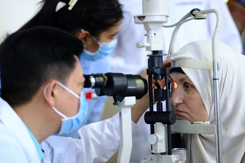 6月12日,“健康快车塔吉克斯坦光明行”活动期间,中国医生为当地白内障患者检查眼底。