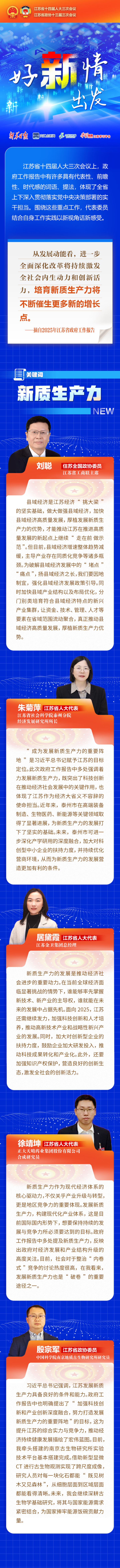 江苏省十四届人大三次会议上,政府工作报告中有许多具有代表性、前瞻性、时代感的词语、提法,体现了全省上下深入贯彻落实党中央决策部署的实干担当。《好“新”情,出发!》首期聚焦“新质生产力”,邀请代表委员结合自身工作实践以新视角话新感受。