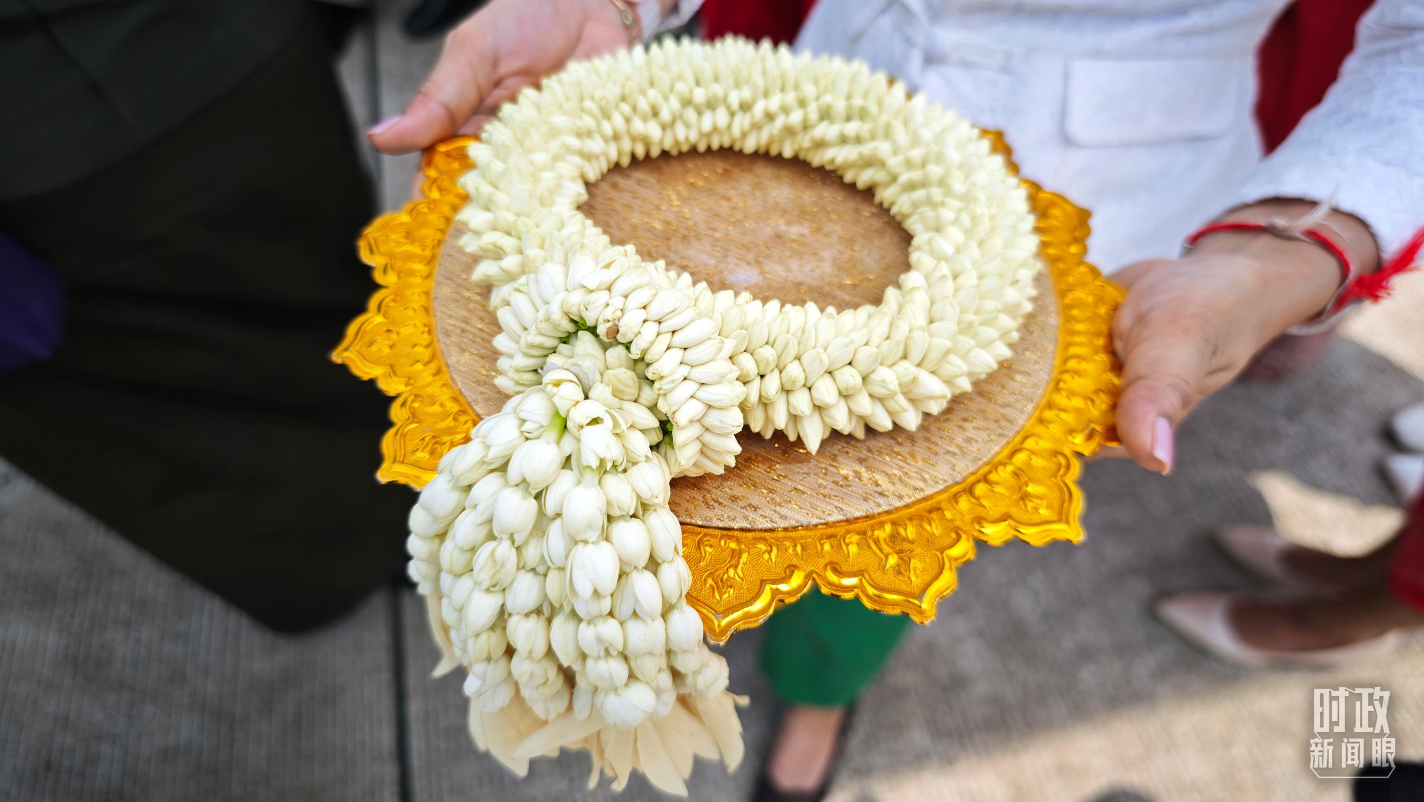△柬埔寨王室珍娜公主向习主席献上的茉莉花手环。(总台央广记者潘毅拍摄)