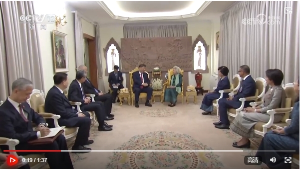 在会见中,西哈莫尼国王用“月月有进步,年年有成果”形容柬中友好合作。当天,他向习主席颁授了“柬埔寨王国民族独立大项链级勋章”。