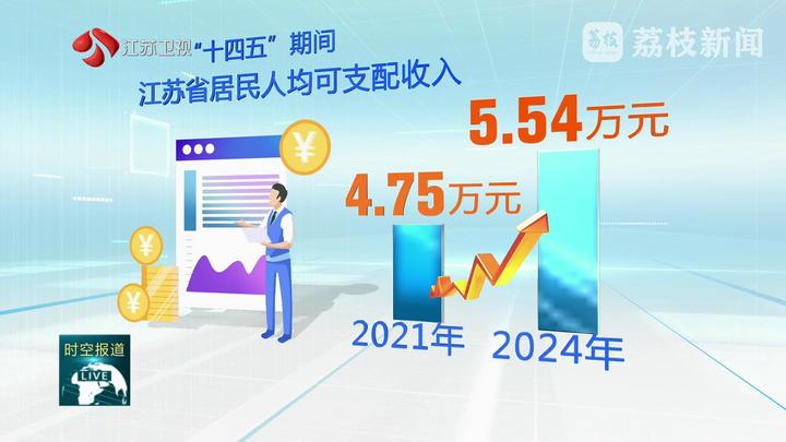 “十四五”期间,江苏居民人均可支配收入从2021年的4.75万元稳步增长到2024年的5.54万元,城乡居民收入比从2.16∶1收窄至2.04∶1,城乡收入差距稳步缩小。