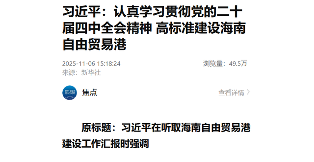 “要认真学习贯彻党的二十届四中全会精神,在党中央集中统一领导下,各级各有关方面密切协作、主动作为,通过持续努力,全面实现海南自由贸易港建设目标。”11月6日,习近平总书记在海南省三亚市听取海南自由贸易港建设工作汇报并发表重要讲话。