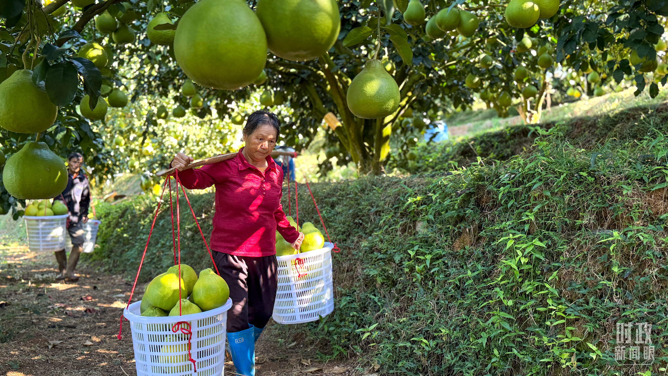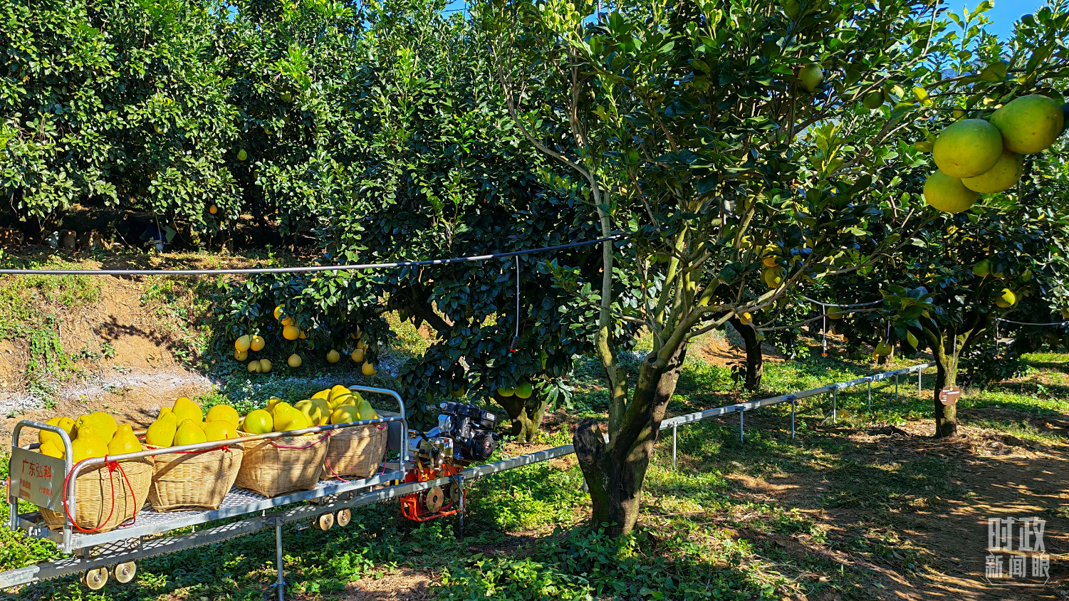 △金柚采摘运送用上了无人轨道车,可大大减轻人力负担。(总台央视记者郭鸿拍摄)