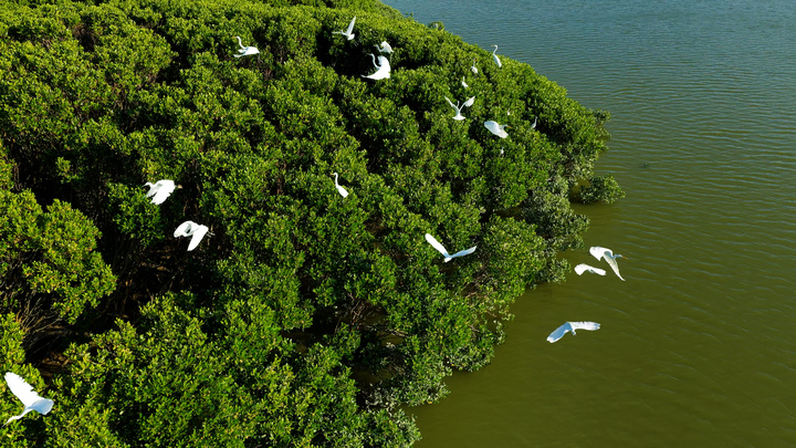 漫步海口镇斗垣村的海岸线,一片绿色森林正向大海深处延伸。绿荫如盖的树冠间,白鹭如繁星点缀,它们或悠然伫立,或展翅低飞,与滩涂上忙碌的弹涂鱼、招潮蟹共同演绎着海岸生命的律动。