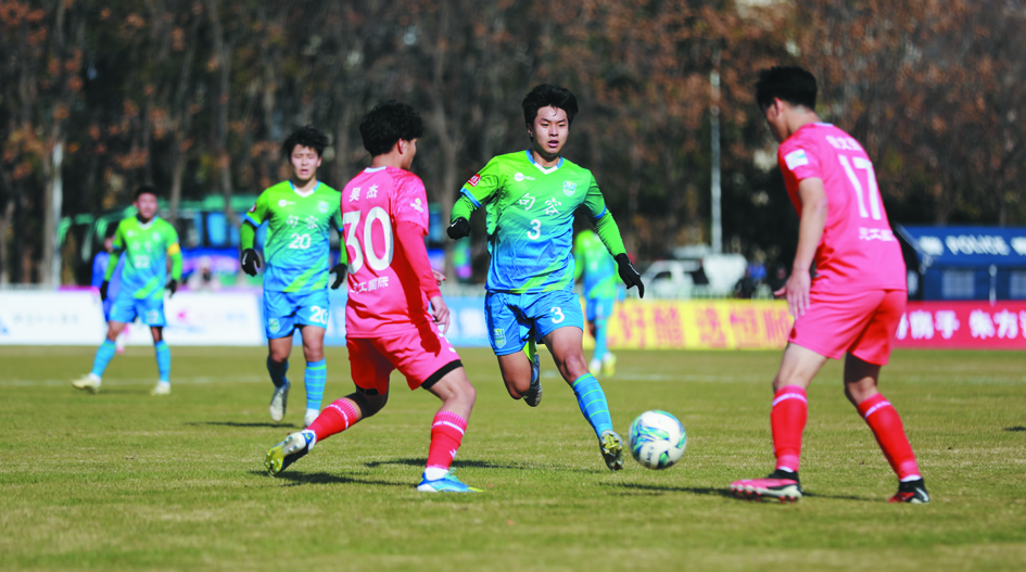 比赛从一开始就完全进入句容队的节奏。开场哨响,蓝色军团便展开了疾风骤雨般的攻势。第14分25秒,8号李文鑫接队友精准传中,以一记势大力沉的头球砸开对方球门,为这场进球盛宴拉开序幕。这粒闪电般的进球彻底点燃了全场气氛,看台上的观众呐喊声震耳欲聋。仅仅两分钟后,句容队再下一城。第16分25秒,9号蔡欣睿凭借出色的个人技术在禁区内制造犯规,为球队赢得宝贵点球。23号徐昕冷静站上罚球点,一蹴而就,将比分扩大为2比0。