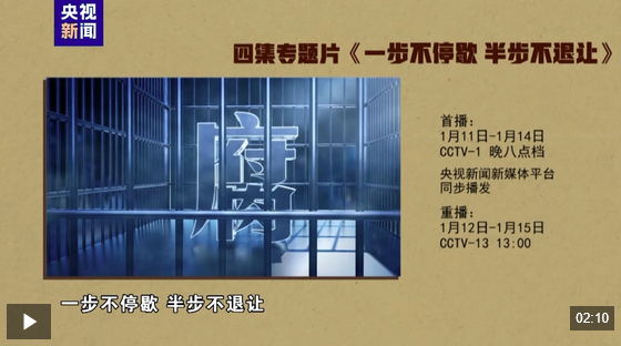 由中央纪委国家监委宣传部与中央广播电视总台央视联合摄制的电视专题片《一步不停歇 半步不退让》,将于1月11日至14日在中央广播电视总台央视综合频道晚8点档播出,央视新闻新媒体平台同步播发。