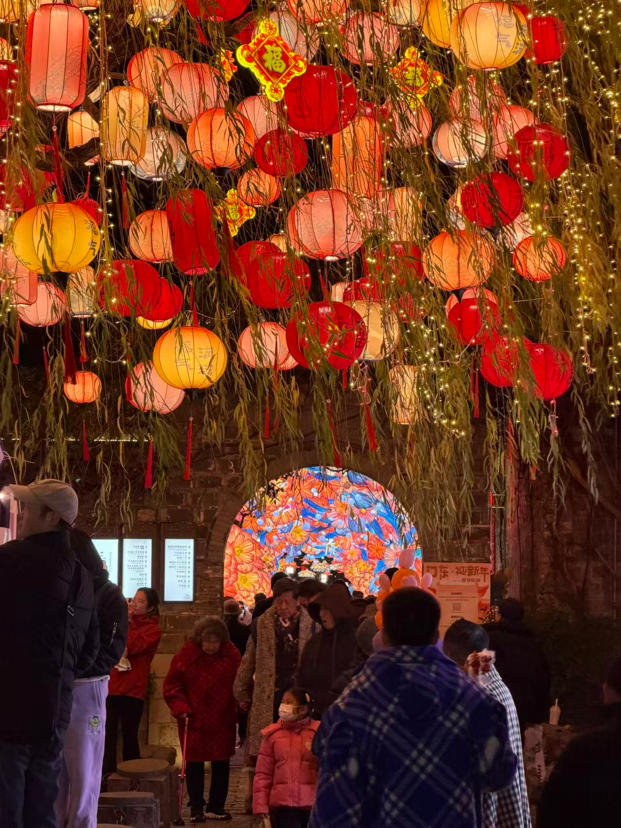 昨晚6时许,暮色四合,南京老门东三条营巷口。随着第一串灯光倏然亮起,围观的人群中顿时响起一阵惊叹声。红、黄、粉三色交织的999盏福灯如星河瀑布般垂落,完美复刻了辛弃疾笔下“东风夜放花千树”的梦幻意境。流光溢彩之下,摩肩接踵的赏灯人群纷纷举着手机、相机,耐心寻找最佳角度。