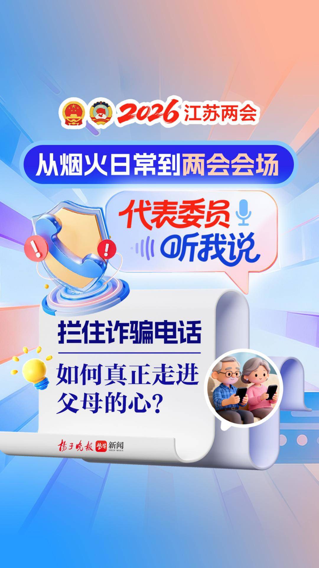 今年省两会召开在即,代表委员们带着来自基层的声音即将走进会场。他们深入城乡社区,倾听群众关切,将百姓的日常烦恼转化为履职建言。近日,扬子晚报/紫牛新闻记者跟随江苏省人大代表、南京市江宁区善晖社会工作服务中心负责人高洁一起走进社区一线,与中老年居民及其子女面对面交流。她关注的问题是:在电信诈骗手段层出不穷的今天,子女如何真正走进父母的内心,筑牢家庭防骗的亲情防线?