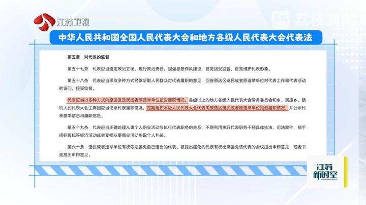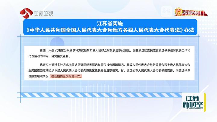 围绕代表法最新要求,2026年1月,江苏本省的实施办法修订通过:明确省、市两级代表在任期内,要向原选举单位至少报告一次履职情况,同时,对代表享受知情知政服务、参加履职学习等作出规范,扩大代表对人大常委会工作的参与,为代表依法履职行权提供制度保障。