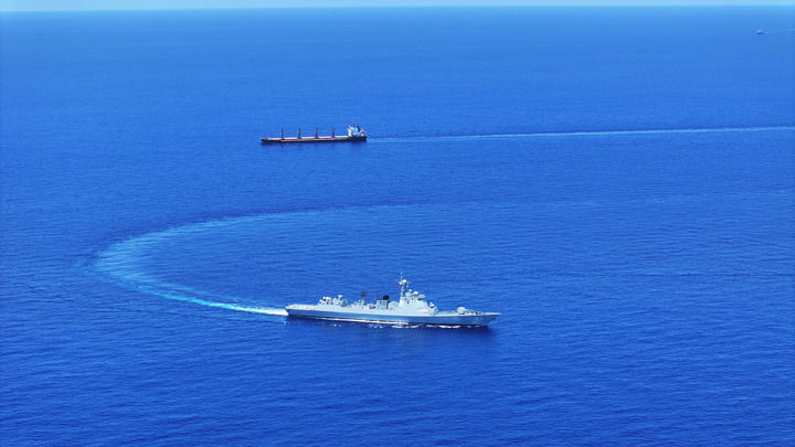 中国海军第46批护航编队焦作舰(下)护送货船至解护点后与之分航(2024年5月7日摄)。新华社发(张大禹 摄)
