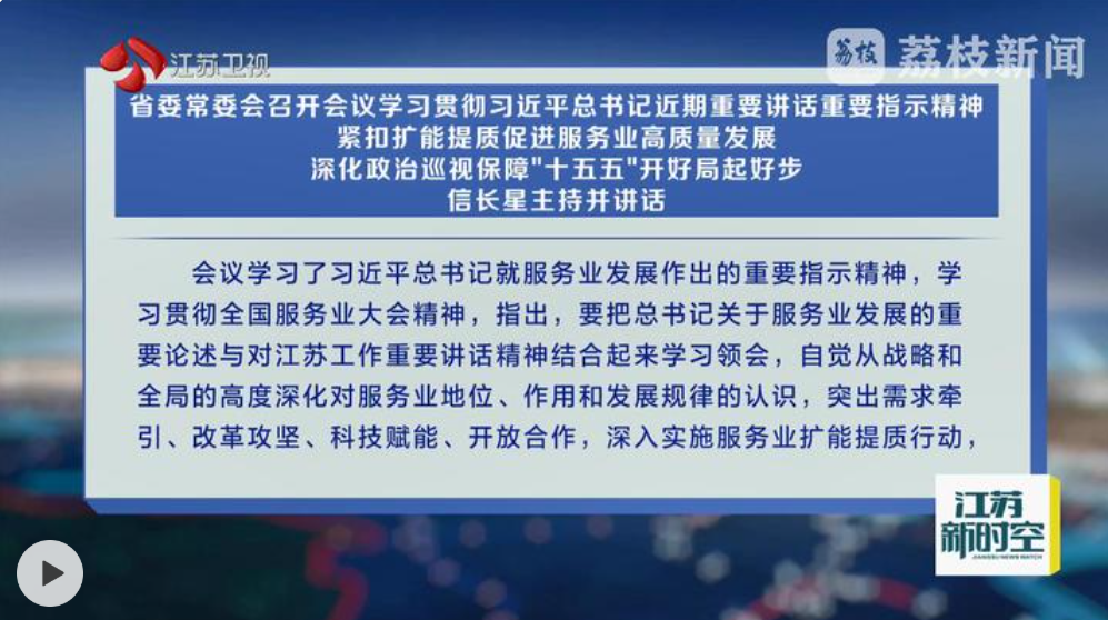 会议学习了习近平总书记就服务业发展作出的重要指示精神,学习贯彻全国服务业大会精神,指出,要把总书记关于服务业发展的重要论述与对江苏工作重要讲话精神结合起来学习领会,自觉从战略和全局的高度深化对服务业地位、作用和发展规律的认识,突出需求牵引、改革攻坚、科技赋能、开放合作,深入实施服务业扩能提质行动,推进生产性服务业向专业化和价值链高端延伸,促进生活性服务业高品质多样化便利化发展,打造一批叫得响、走得远的服务品牌,推动我省服务业高质量发展,更好支撑产业升级、满足民生需要、带动就业扩容。全省各地要立足自身条件,因地制宜发展服务业,培育新的经济增长点。