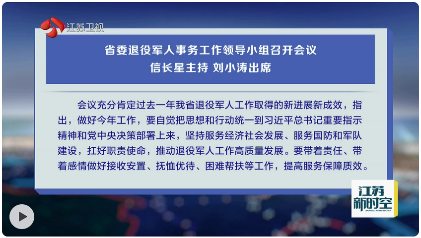 4月13日,省委退役军人事务工作领导小组召开会议,深入学习贯彻习近平总书记关于退役军人工作的重要论述和对江苏工作重要讲话精神,研究部署今年重点任务。省委书记、领导小组组长信长星主持会议并讲话,省长、领导小组副组长刘小涛出席会议。